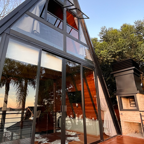 A área interna é ampla e acolhedora, com dois quartos confortáveis, banheiro completo e uma sala equipada com sofá espaçoso, televisão, lareira automática e uma banheira integrada ao ambiente, perfeita para relaxar enquanto curte a vista. Todas as peças possuem ar-condicionado, garantindo bem-estar o ano todo. Do lado de fora, o fireplace e o spa vitro com hidromassagem aquecida completam o clima de descanso, seja de dia ou à noite, sob o céu estrelado.