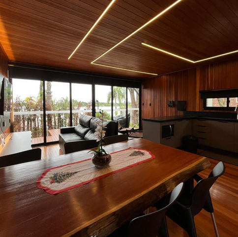 A sala combina praticidade e aconchego, com sofá confortável, televisão e lareira automática que tornam os dias frios ainda mais especiais. Todos os ambientes contam com ar-condicionado, garantindo conforto em qualquer época do ano. Na área externa, o spa vitro e o fireplace criam um cenário perfeito para relaxar com estilo, seja curtindo o calor da água, uma boa conversa ou o brilho da fogueira nas noites frias.